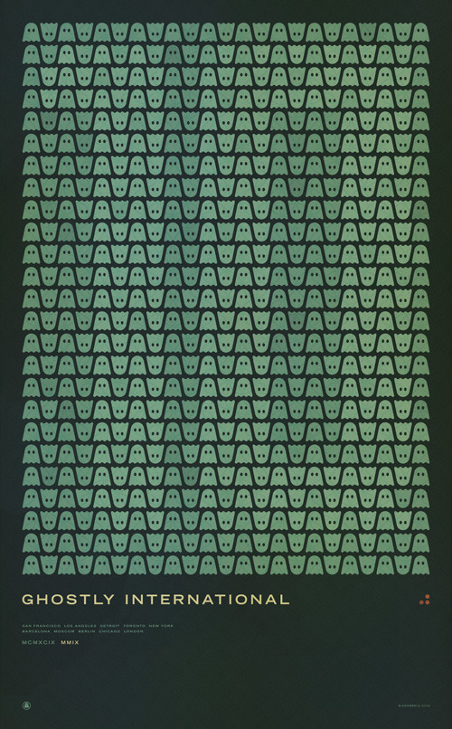 Check out this excellent “Ghostly International” poster by Scott Hansen at ISO50. Ghostly International is celebrating 10 years of success as an electronic music record label. You can own this poster for a mere $150. A little much for me, but I love the Pac-Man style ghosts that they use as their logotype.