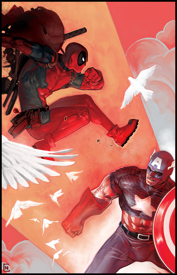 Posted byJustinRampageAugust 26, 2009February 14, 2022Posted inUncategorizedTags:Captain America, Christian Nauck, comics, dc, deadpool, illustration, Mana, Marvel Excellent illustration of the Cap taking on Deadpool. Deadpool Vs. Cap by Christian Nauck (Blog) (Twitter) Related