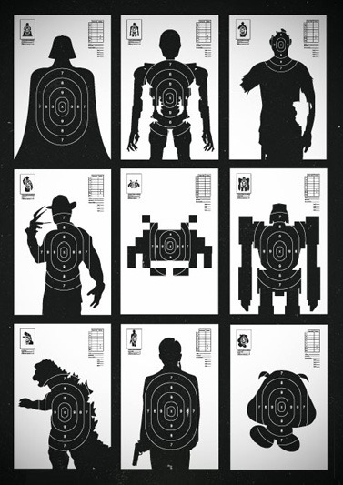 Custom shooting targets designed by Olly Moss. (Again!) I dunno if I like the Godzilla, goomba or zombie one most.