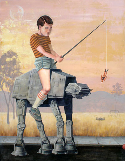 I love how the Death Star is far off in the sky and the kid is dangling a rebel pilot figurine off a fishing pole. So cool!