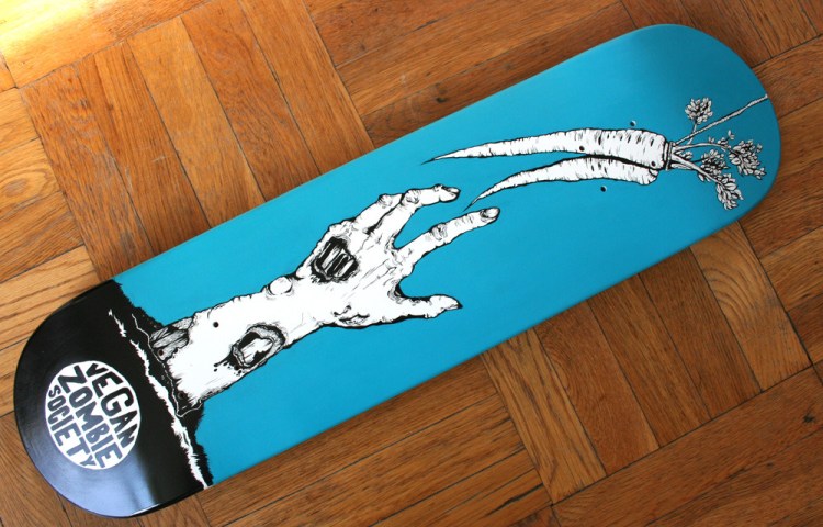 Cool Vegan Zombie skateboard art by Shalimar Luis. I’m no skateboarder, but I wouldn’t mind it hanging up on the wall at home. Those crazy vegan zombies!