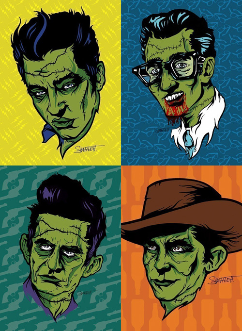 Hellvis Presley, Bloody Holly, Johnny Crash, and Hank Killed’Em from the “Dead Legends” series by Nik Scarlett