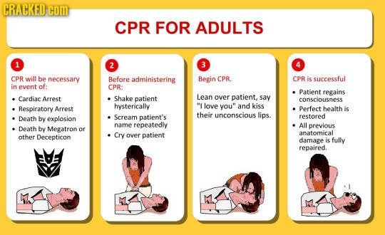This is how CPR is done in Hollywood! They always get up after a kiss and a “I love you”.