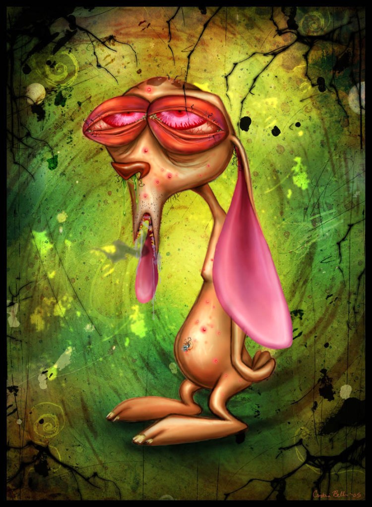 Ren Höek, the loose cannon chihuahua in the grotesque style classic to the cartoon. Excellent illustration by Cristina Beller. “What EEZ IT, man?”