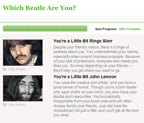 Posted byJustinRampageSeptember 7, 2009February 14, 2022Posted inUncategorized I’m part Ringo and part Lennon. Which of the Beatles are you? Check it out at Spinner.com Related