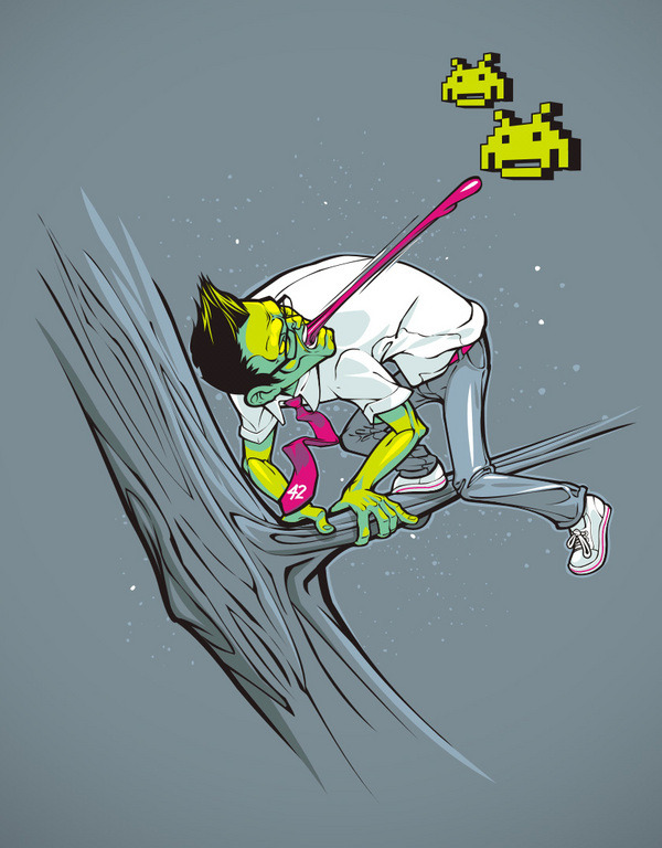 I love this illustration of a zombie trying to take out a couple space invaders. I wish I knew who originally created this.