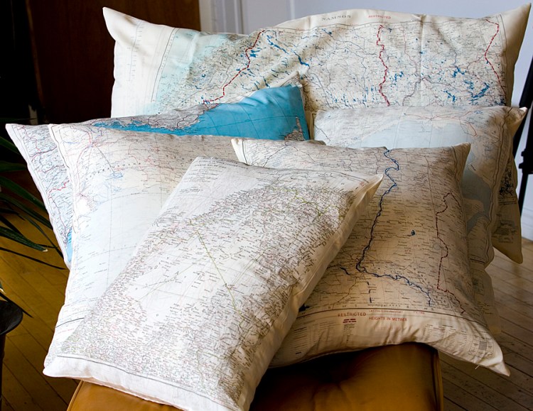 Silk Map Aviator Cushions by Alex Jowett of Atelier 688 $180 – $350