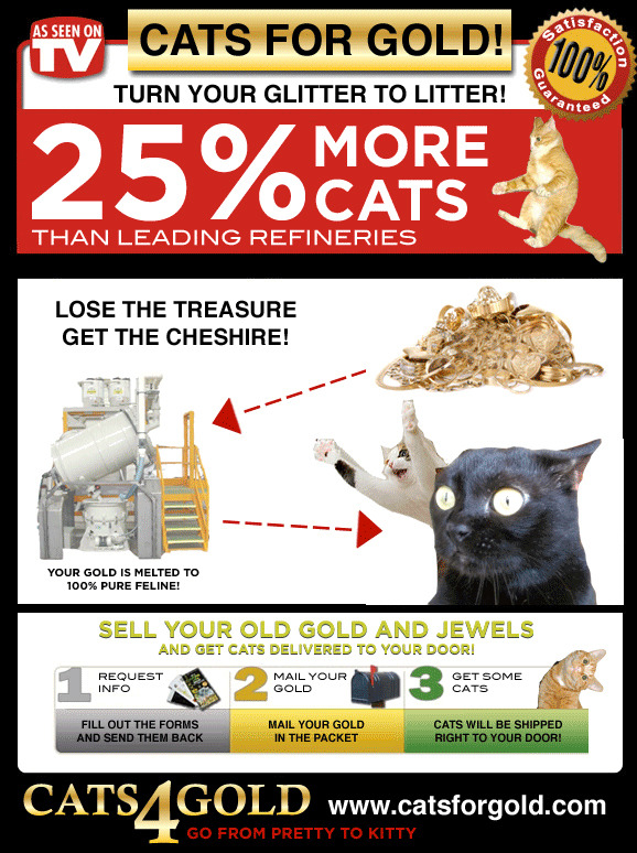 Have some extra gold taking up space in the house? Get over to CatsForGold.com and have that gold melted into a brand spankin new %100 Feline!