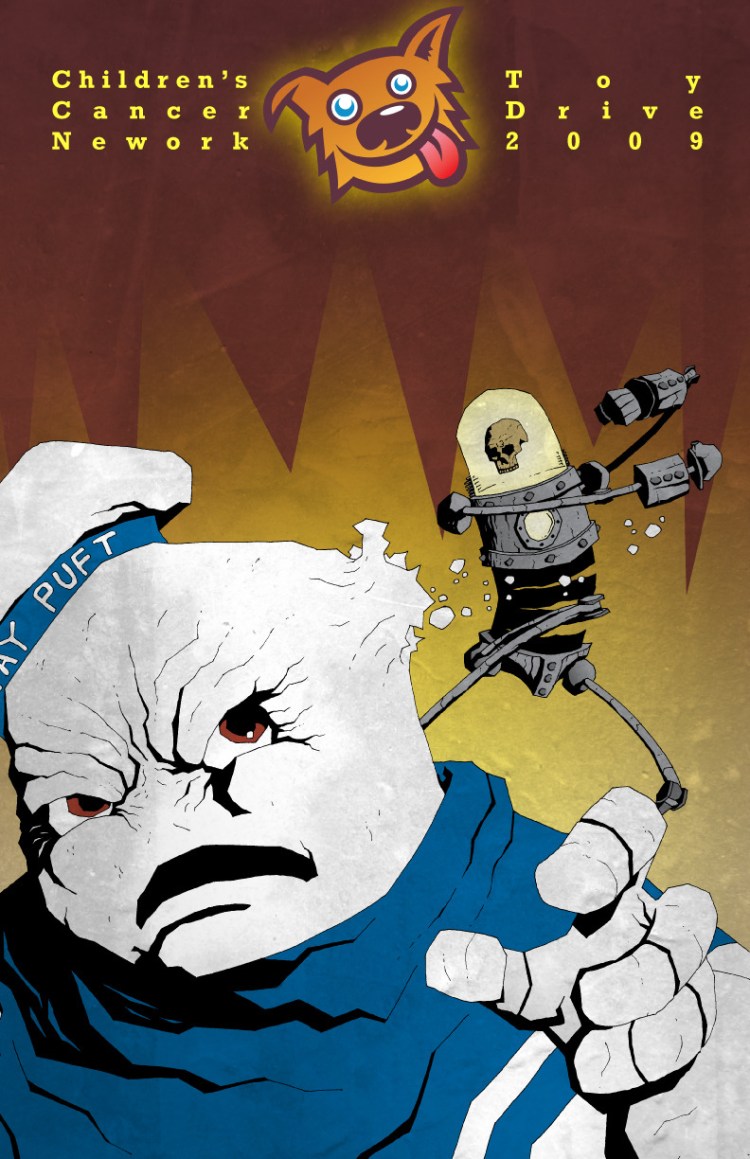 This is a great poster! It was made for the Children’s Cancer Network Toy Drive being held at Spazdog Comics in Glendale, AZ. A little bit of the Ghostbusters mixed with Robot 13.