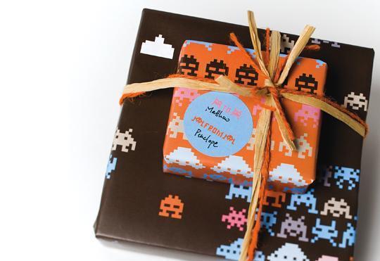 Space Invaders gift wrap! Grab yourself one double-sided 24" x 36"sheet of wrap for $4.50. A little steep for one sheet, but it’s worth it… Feed the nerd craving…