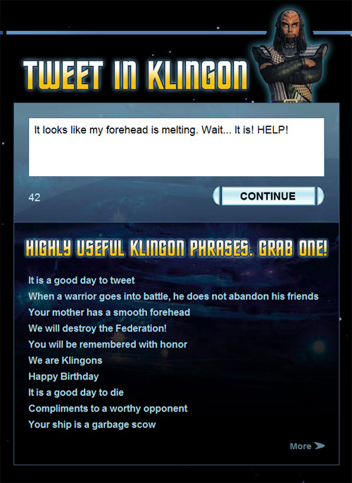 Send out a Tweet in Kilingon today! Star Trek Online released a viral tool that allows you to translate your weak humanoid speech into complete useless gibberish trekker trash… I mean Klingon…