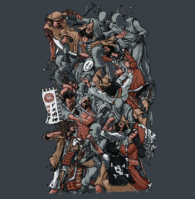 Prepare for an Epic Battle! Pirates and Ninjas throw down on this great shirt!
