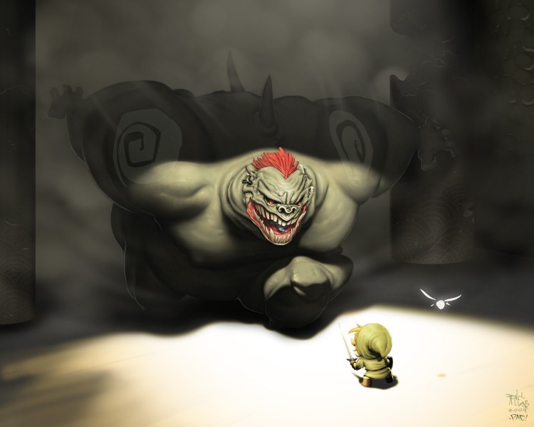 Little Link might not look like much of a fright to the gigantic Ganon, but you just wait… I just hope Link stocked up on hearts before running into the arena.