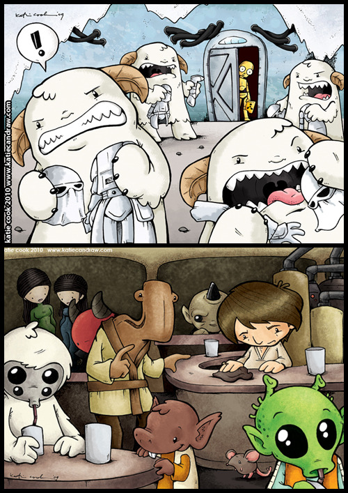 Check out both of these wonderful Star Wars cards by Katie Cook for the upcoming TOPPS Star Wars Galaxy 5 Trading Card Set. C-3P0 taking the warning sign down while watching the Wampas administer a beat down cracks me up.