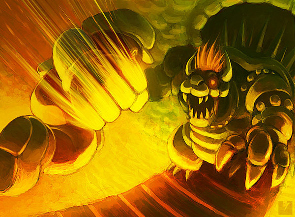 Mario ate his Wheaties w/ magic mushrooms this morning and is now ready to deal out a Super Mario BEAT DOWN! Bowser will never learn his lesson, I guess.