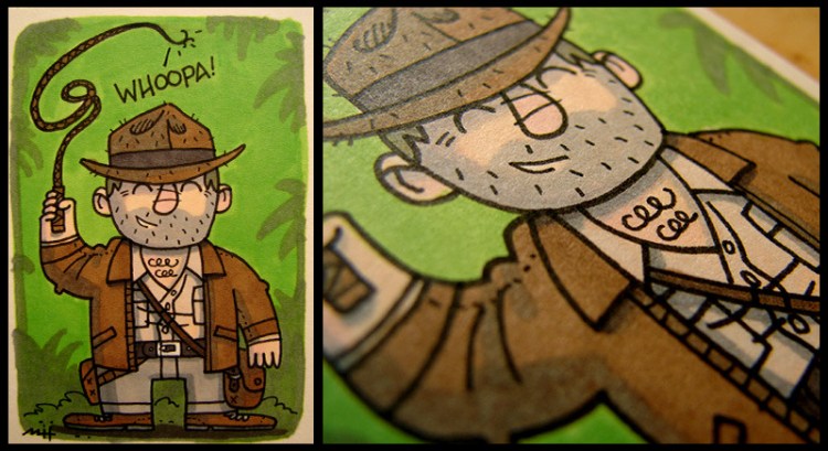 Well, if it isn’t the classic Indiana Jones in cute cartoon form! As usual, he is goofing off with his trusty whip! This little guy is too damn cool.