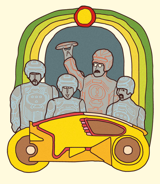Simply amazing design! Those Beatles would totally rock the Yellow Light Bike Submarine! Someone should really run with this idea and create an animated Beatles music video. Lennon is the chosen Walrus! He will save them all from the Master Control Program!