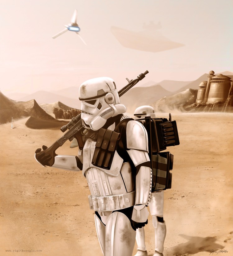 Here we have two worn out Stormtroopers who are combing the desert in search of Jedi scum. Amazing illustration by Yigit Koroglu. The level of detail is killer. Wow!
