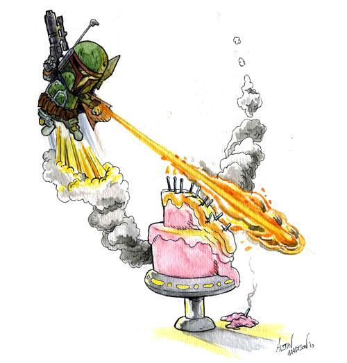 Boba Fett lights up a Birthday Cake in celebration of Andy Madison’s 33rd Birthday and The Empire Strikes Back turning 30 over the past weekend. Austin Madison (Pixar Animator) really hooked his brother up with this illustration.