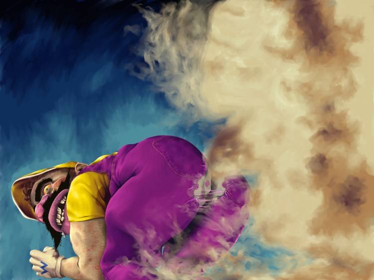 Fire in the hole! Check out one of Wario’s Super Smash Bros. Brawl signature moves! Dustin Wilson wanted to use the same style as Bill Wray did for the nasty closeup llustrations on The Ren & Stimpy Show. He did a great job, to say the least.