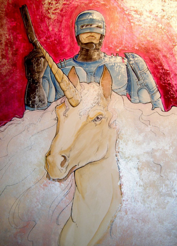 Robocop doesn’t care about the humans laughing at him as he gallops through town on his unicorn. He’s on official police business!
