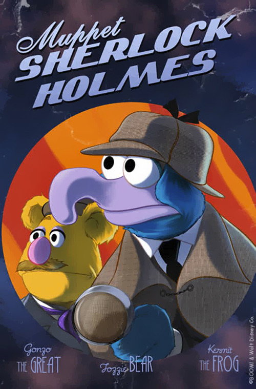 Excellent illustrated cover for the third issue of Muppet Sherlock Holmes. Amy Mebberson parodied this design off of the old Sherlock Holmes movie poster starring Basil Rathbone. Gonzo is a bad ass.