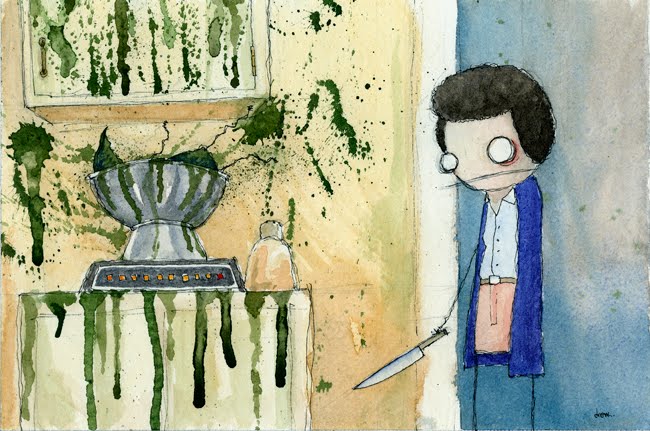 Stay Puft Marshmallow Man gets roasted! Drew Falchetta recreated one of my favorite scenes from the Ghostbusters film. This watercolor piece, along with his Goonies and Gremlins artwork, was submitted for Gallery 1988’s 3G show.