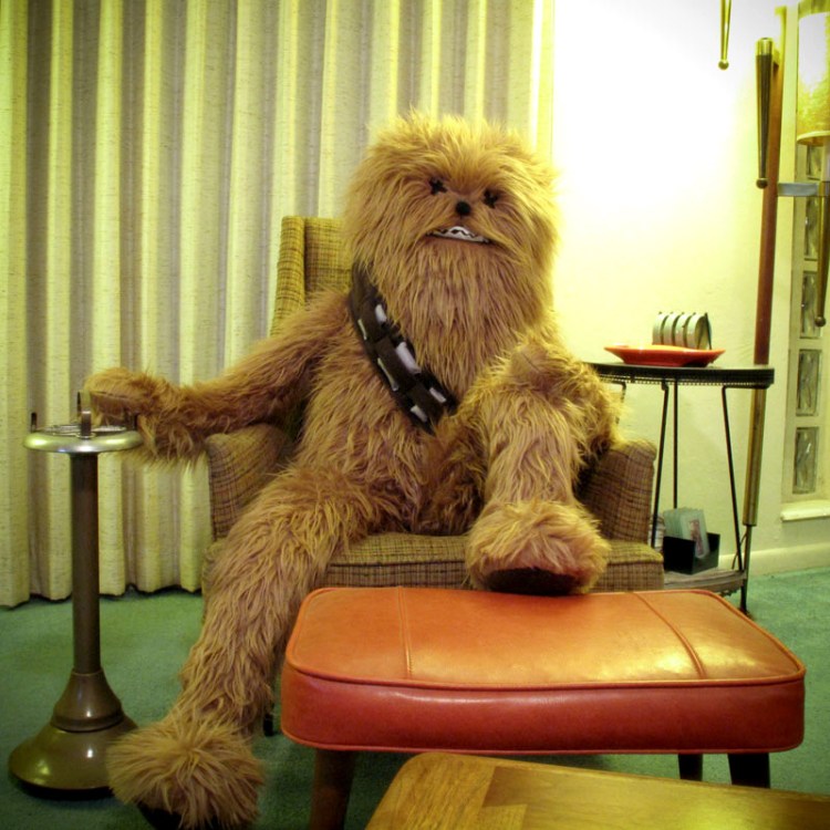 Chewbacca kicks back for a bit and gets some photos taken. Chewie has had a few to drink I think. This furry artwork is part of Bear and Bird Gallery’s “Stitch Wars” exhibition in Lauderhill, Florida.
