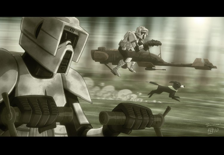 Digital commission by Otis Frampton featuring Scout troopers on speeder bikes and a fleet footed pup!