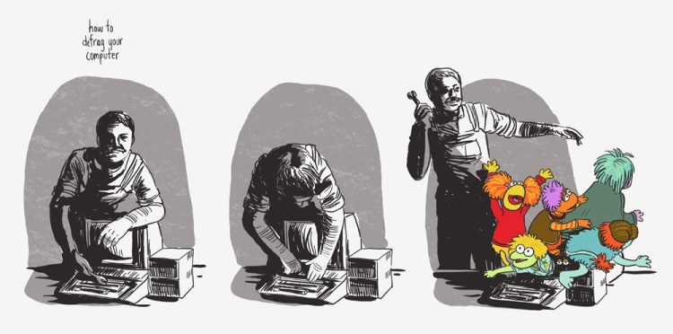 Do you walk away while the computer defrags? Maybe, after seeing this illustration by Julia Sonmi Heglund, you will hang around next time.