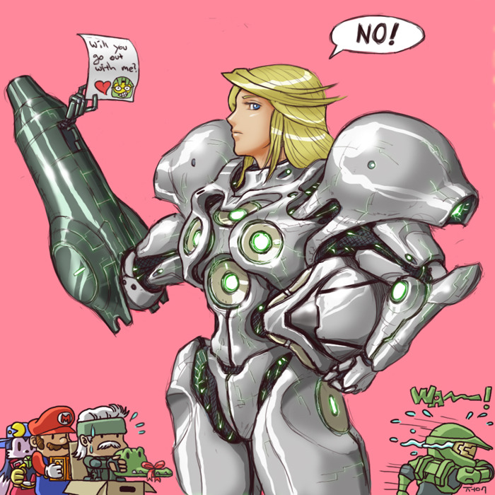 Samus just threw down the gauntlet on old cry baby Master Chief. Snake isn’t looking too confident about his gift now. Hilarious artwork by James Chung.