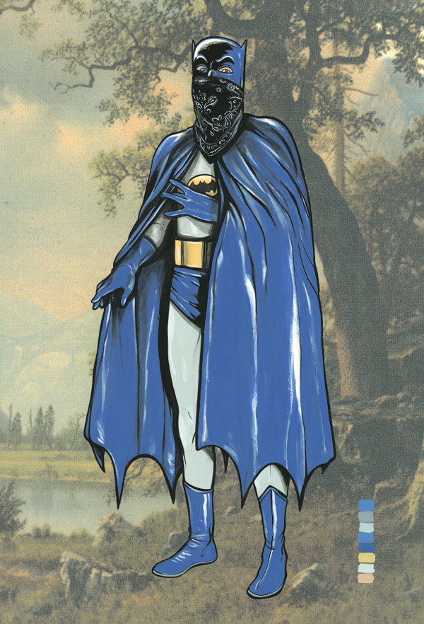 Two well known superheroes, two rival gangs. Will Superman’s stone cold killer powers overcome Batman’s 100 dollar bills y’all? Steve Seely created these rad pieces for an upcoming show at Rotofugi.
