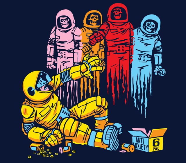 Travis Pitts put a realistic sci-fi spin on old Pac-Man in this rad shirt design. Good thing that he has his 6 Pac of anti-anxienty power pellets. Buy this pactastic shirt up at Threadless for $18!