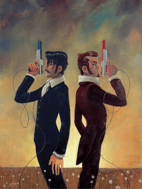 Two distinguished gentlemen challenge one another to a NES Zapper / Light Gun duel to the 8-bit death in this killer piece by Aaron Jasinski. Pew Pew Pew!