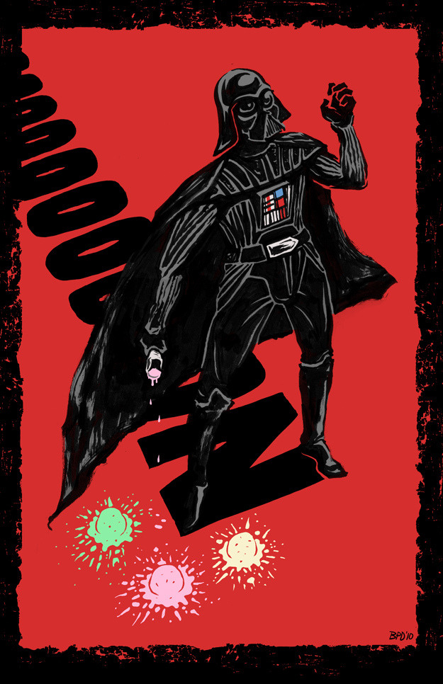 Even Dark Lord Vader finds it difficult to resist a delicious ice cream cone. Brain freeze is a killer though! Sweet illustration skills by Burt Durand.