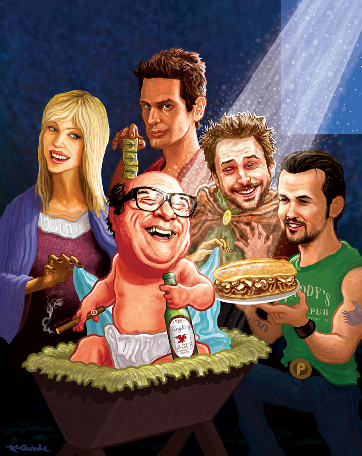 Hilarious “It’s Always Sunny in Philadelphia” artwork by Patrick McQuade. Check it out on the cover of Royal Flush #7 at http://www.rfmag.com!