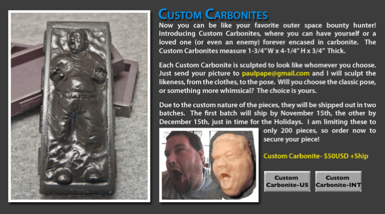 Have someone you love or hate and want them trapped in carbonite? Want to eat it afterward? Check out Paul Pape’s awesome Custom Carbonite Chocolates.