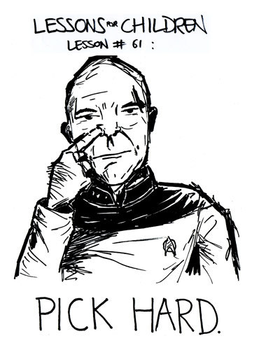 One of the many hilarious Lessons For Children comics that are put together by Paul Verhoeven for The Vine. It’s Captain Jean-Luc Pick Hard!