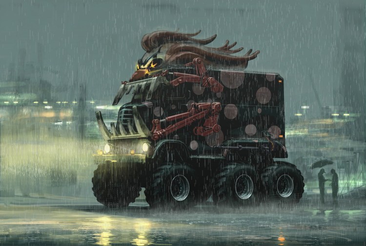 Dark Tooth Twisted Metal vehicle concept artwork by Donald Yatomi. It looks like some sort of deal is going down in the background.