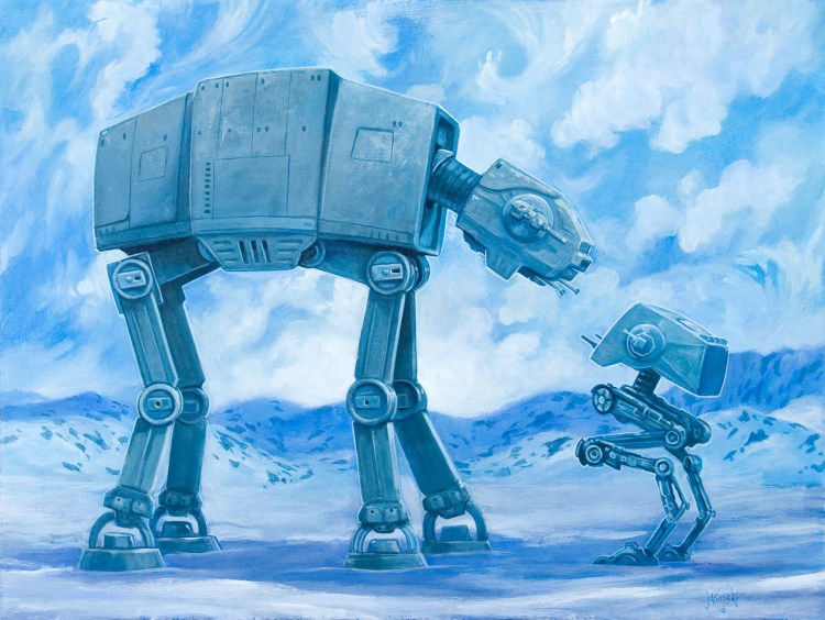 The AT-AT and AT-ST share a friendly war story in this Star Wars piece that Aaron Jasinski created for his Screaming Sky Gallery “Tête-à-Tête” show.