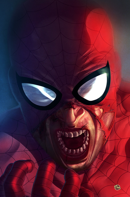 Spider-Man has just been driven into the red. You don’t want a Spider-Man in the red. Such a dramatic piece of artwork by Stefani Rennee.
