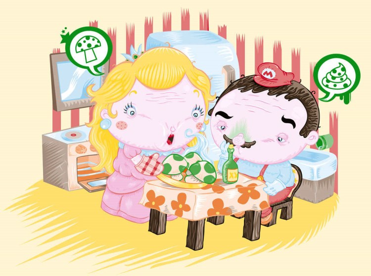 Mario looks REALLY excited about the fried 1-Up mushrooms that Princess Peach made for dinner. Fun concept / style in this piece by Franck Graetz.