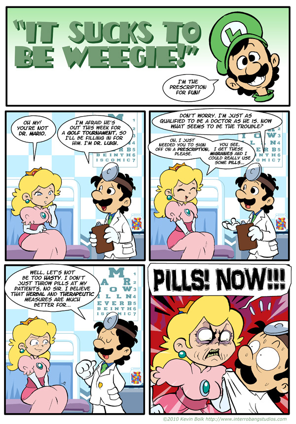 Luigi continues to get bitch slapped around in the funny “Sucks to be Weegie” comics created by Kevin Bolk. Today Luigi tries to fill in for his bro Dr. Mario…