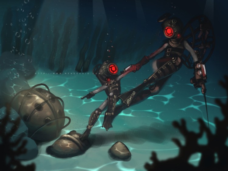 When Big Sister took Little Sister out for a swim, they came across the remains of Mr. Bubbles / Big Daddy. Hell of a BioShock illustration by Renee Chio.