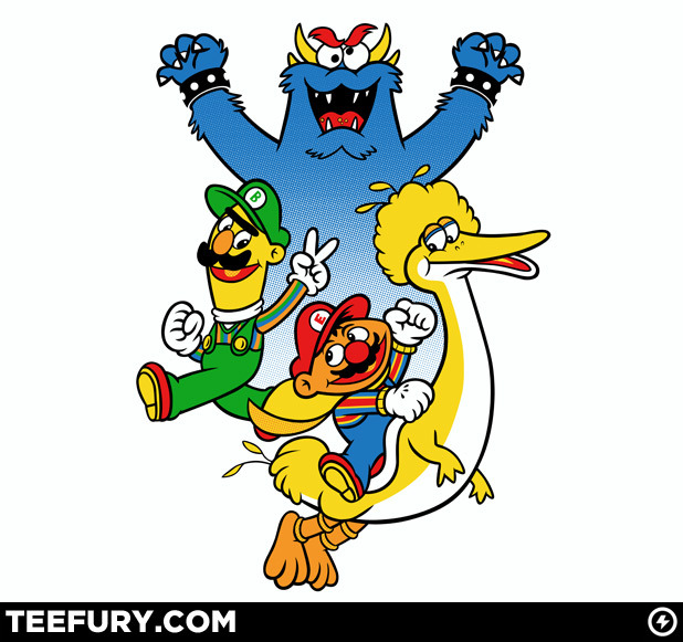 Ernie and the Sesame Street gang get a Mushroom Kingdom remix! Check out Andy Gonsalves’ mash up shirt design for sale Monday (01/03) at TeeFury.