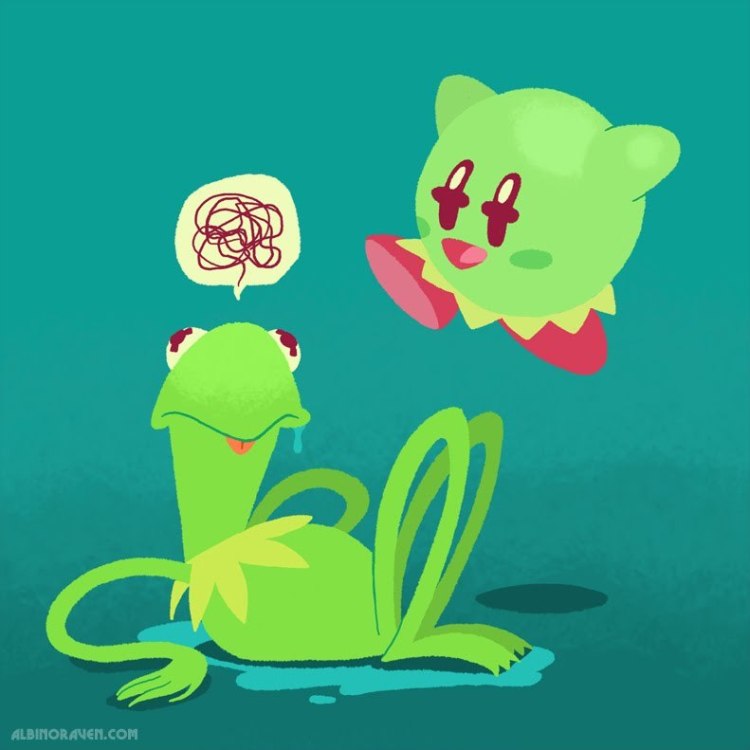 Artist Glen Brogan had a little fun with Kirby’s inhale, copy and vomit ability. Kermit, on the other hand, did not share the enthusiasm. “Kirby the hog here!”