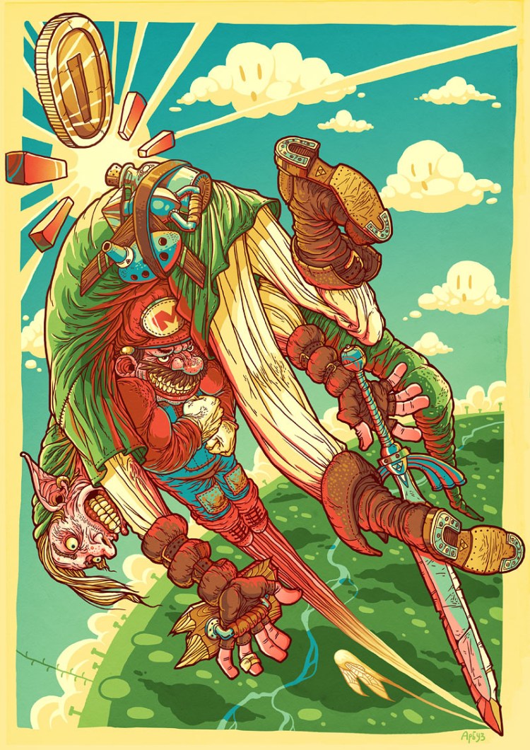 The epic rivalry between Nintendo’s Mario and Link takes to the stars in this amazing illustration by Artyom Bizyaev. All of that for one coin!