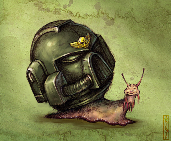 This snail has the right idea! Artist Beata Kurkul put together a humorous piece of Warhammer 40k fan art. Check out more in her gallery.