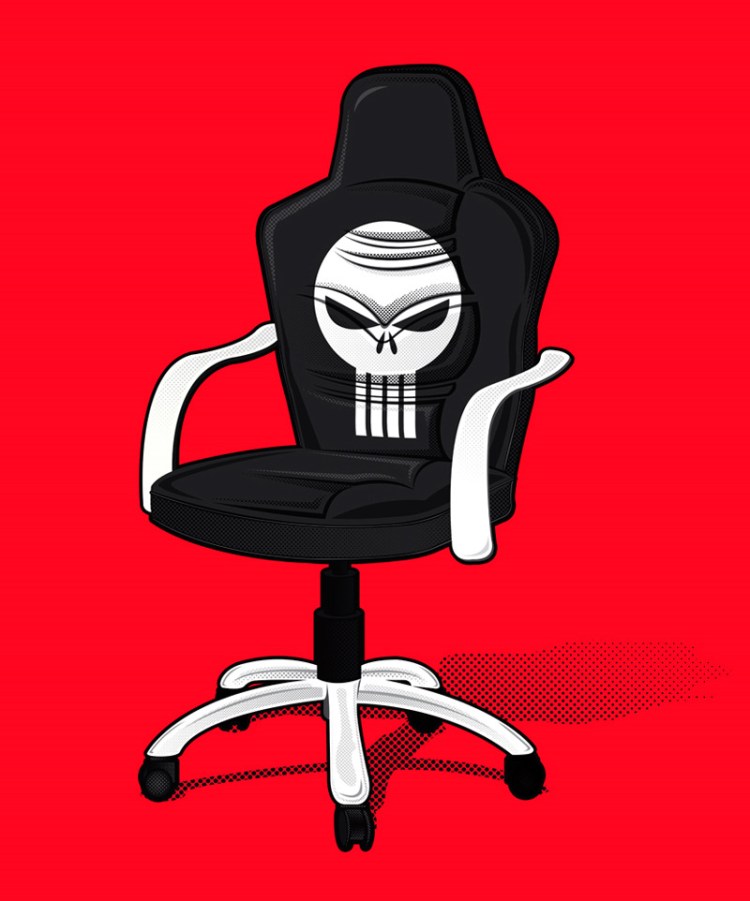 “The Punichair” is the only chair that will kick your ass when you sit in it! Hilarious Frank Castle (The Punisher) / chair mash up design by Fabian Glez.