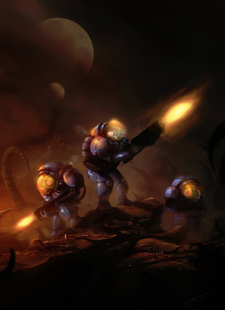 Those little Murloc rascals from World of Warcraft get a Starcraft marine upgrade in Jorge Jacinto’s most recent fan art mash up.